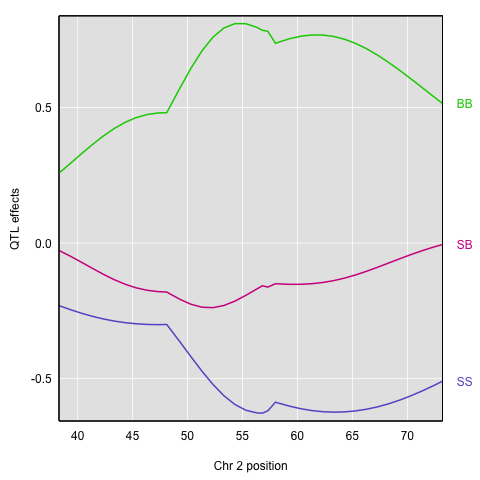 The plot shows effect values on the y-axis and cM values on the x-axis. The value of the intercept (μ) appears at the top. The effect of the SB genotype is centered around zero, with the effects of the other two genotypes above and below.