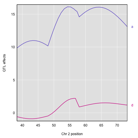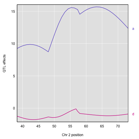 Here’s a plot of the chromosome 2 additive and dominance effects, which are in the second and third columns.